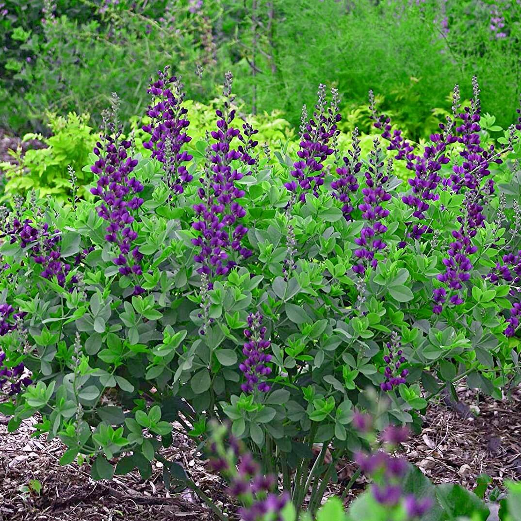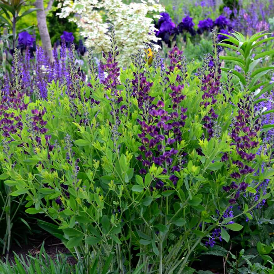Baptisia Grape Taffy este ideala pentru gradini mici, creste compact si se dezvolta echilibrat ca o tufa rotunda si robusta, plina de spice indigo incepand din mai si pana la sfarsit de iunie. Dupa trecerea perioadei de inflorire, tufa de baptisia ramane decorativa prin frunzisul elegant verde albastrui, foliaj care sare in ochi printre alte plante perene si pune in valoare trandafirii cerise si visinii, sedumurile rosiatice, salviile violet, spicele groase de nepeta albastruie, dar si florile movulii ale clematitelor erbacee. In acelasi timp, langa Baptisia trandafirii galbeni si caisa pur si simplu stralucesc, prin contrast!
