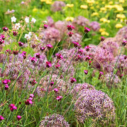Trandafirii compacti, cum ar fi Boscobel si Roald Dahl, si plantele perene de mici dimensiuni, de exemplu Salvia, Gaura, Verbena, Stipa tenuissima, Festuca, Pennisetum, Echinacea, Nepeta,Echinops, Lavandula, Coreopsis etc … sunt partenerii potriviti pentru Dianthus carthusianorum.