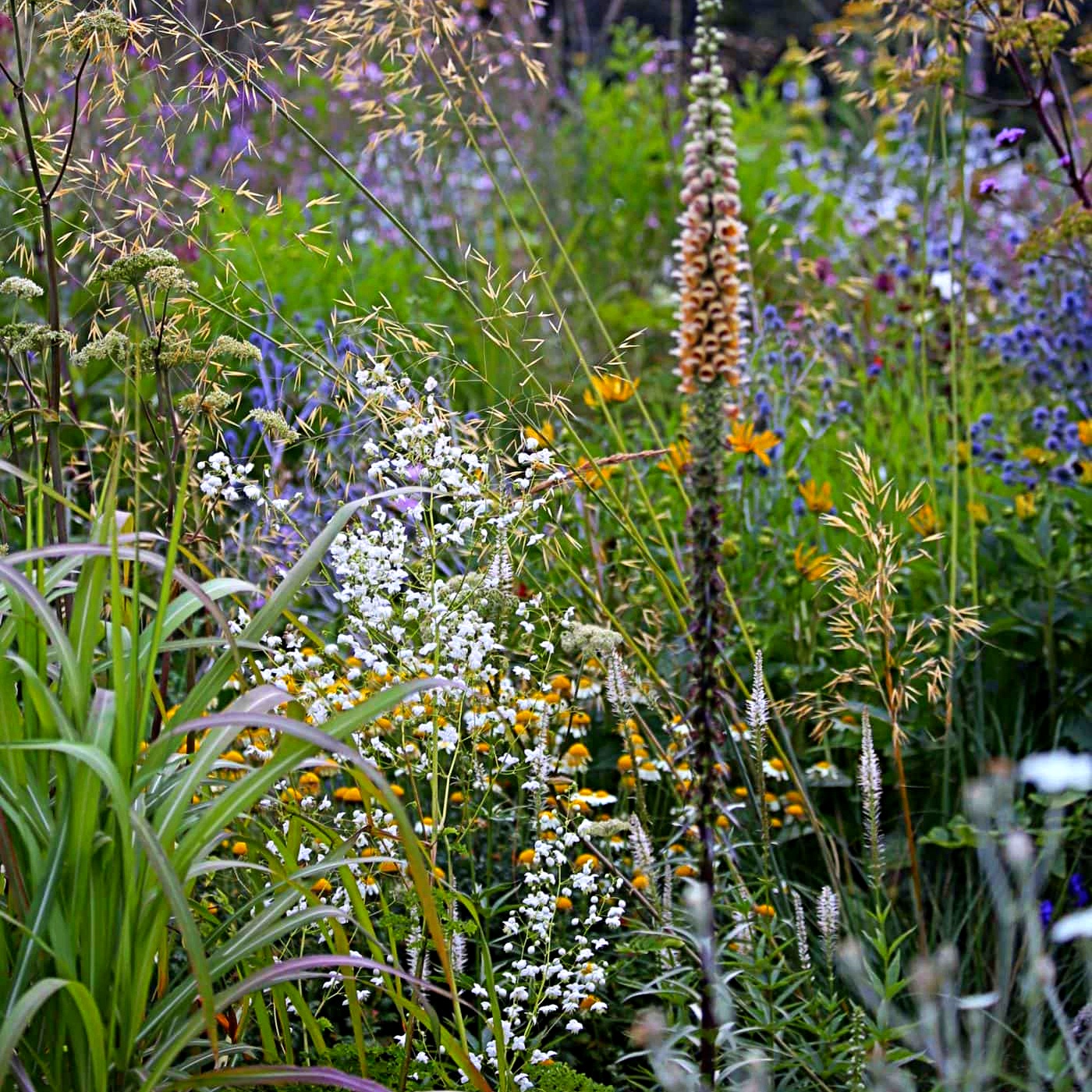 Plantati Thalictrum Splendide White in straturi mixte cu plante perene si trandafiri roz sau galbeni.