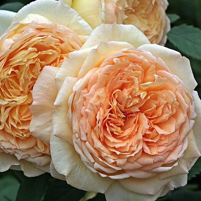 Florile sunt mari si elaborate, formate din numeroase petale usor ondulate care se deschid treptat intr-o rozeta ampla si bogata. Nuanta lor imbina tonuri calde de caisiu luminos cu accente de roz pal si galben delicat, creand un efect sofisticat si foarte luminos in gradina. In toate etapele infloririi, de la boboc la floarea complet deschisa, Bathsheba pastreaza o prezenta rafinata.