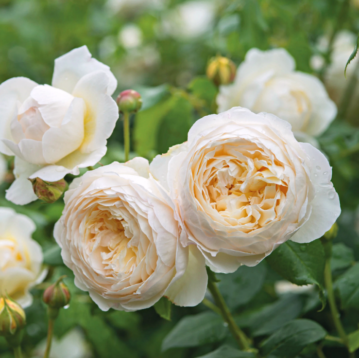Trandafir catarator David Austin cu flori albe elegante si parfum intens de vanilie si mirt. Romantic, rafinat si ideal pentru pergole, arcade sau colturi luminoase din gradina.