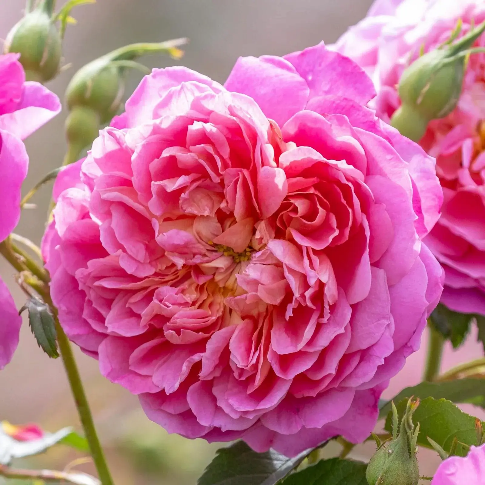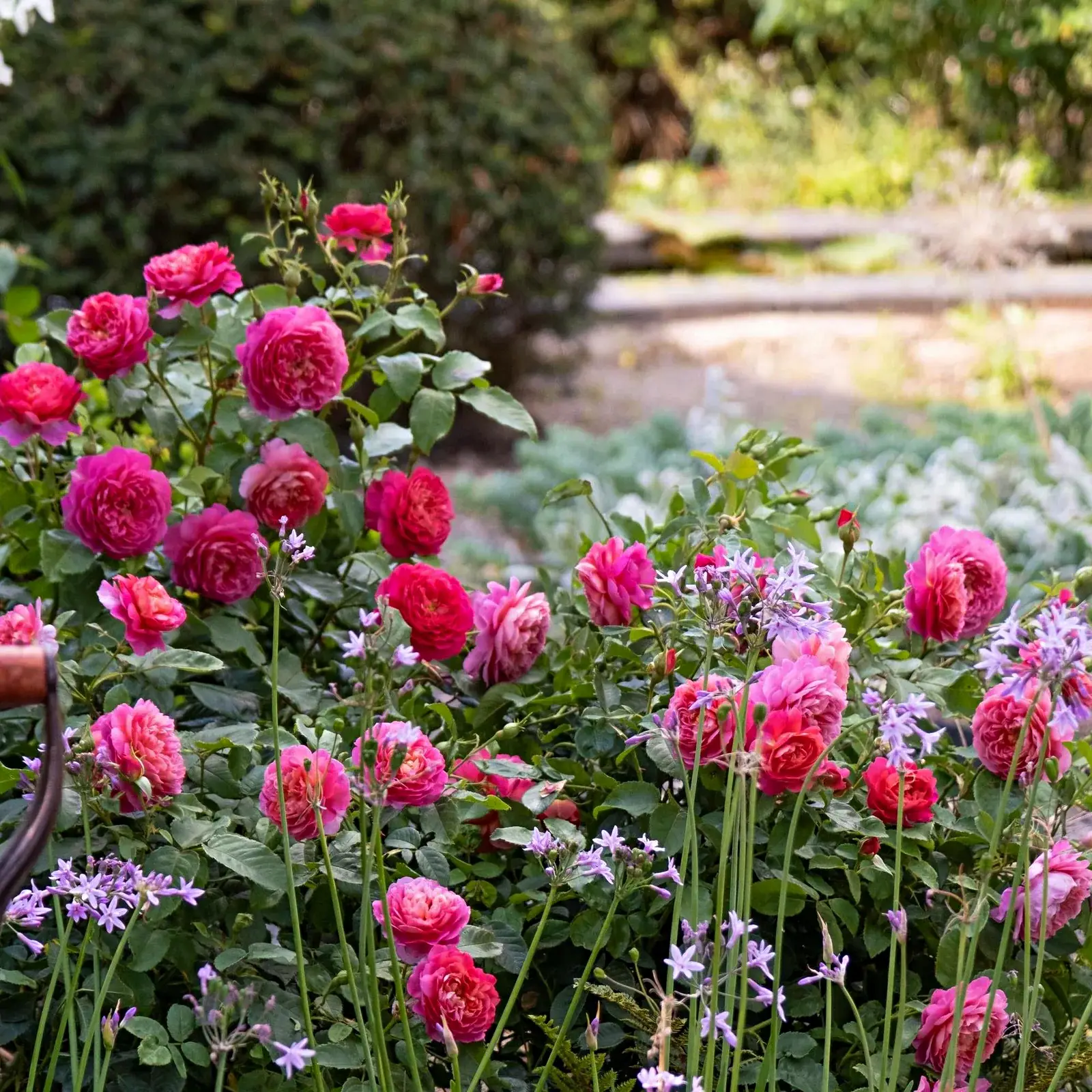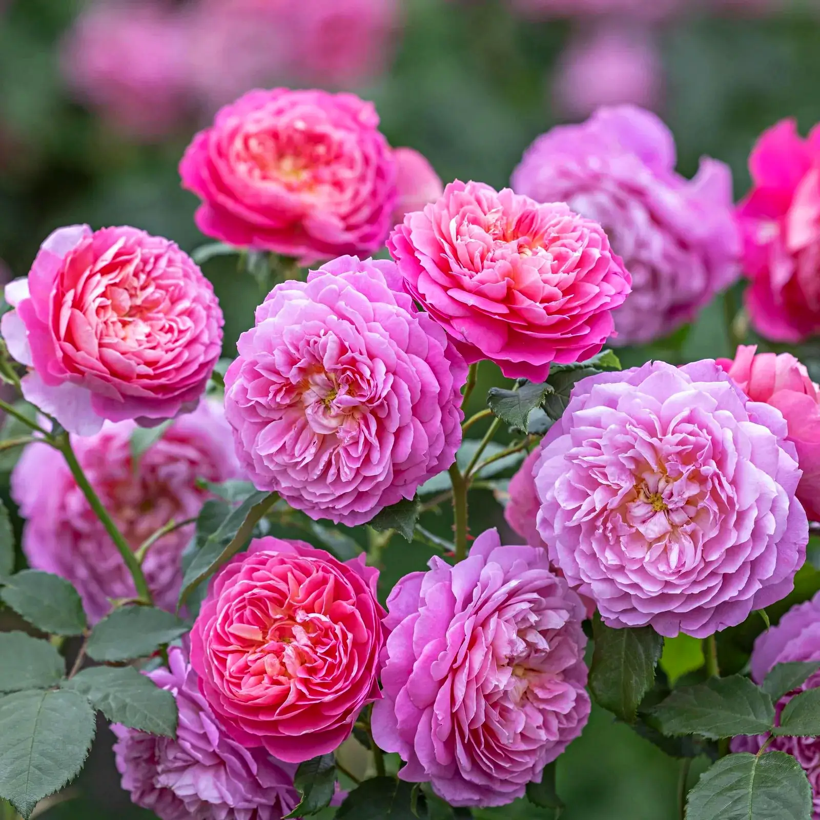 Trandafir englezesc David Austin foarte florifer, cu flori mari, pline, care isi schimba culoarea de la roz-coral cald la tonuri de rubiniu si lila. Formeaza o tufa viguroasa, bogata, potrivita pentru gradini insorite.