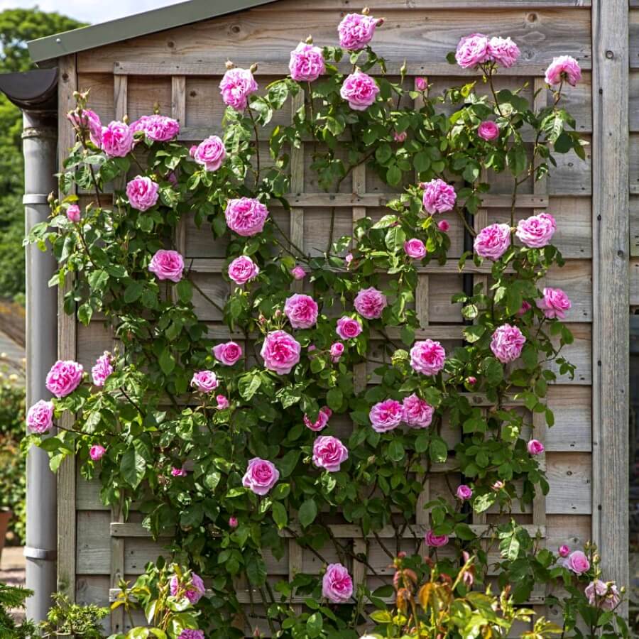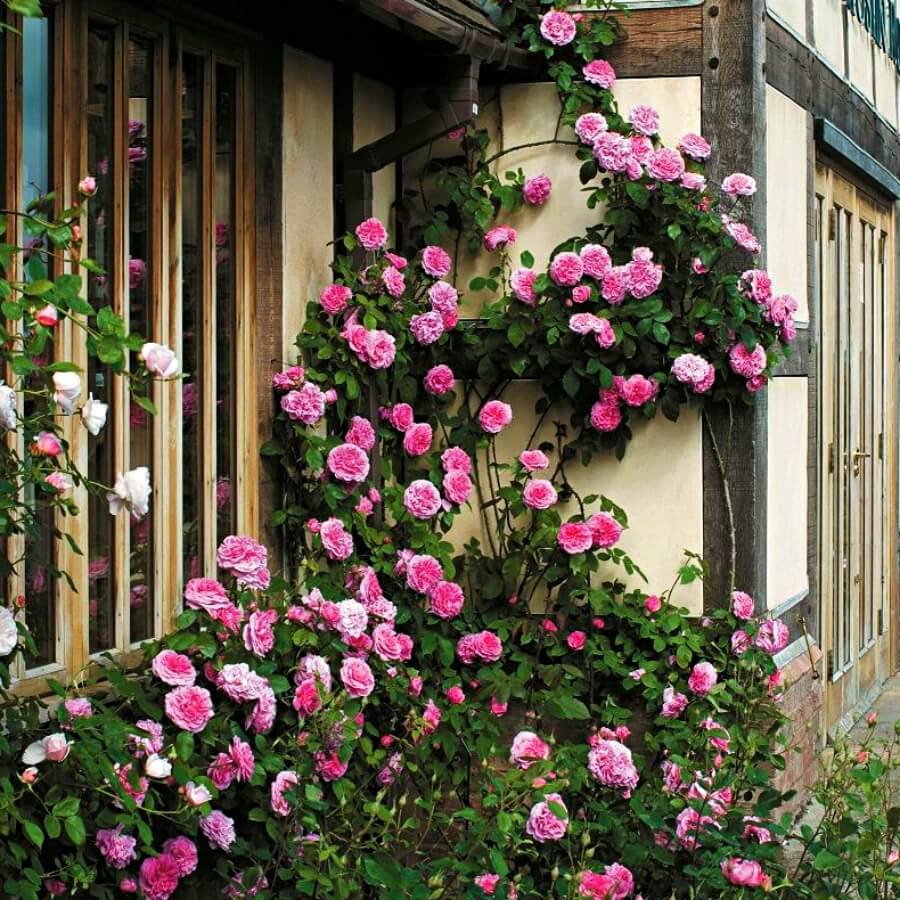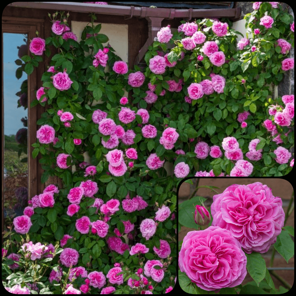 Florile lui Gertrude sunt mari, roz-bombon, pline si bogat ornamentate cu zeci de petale dispuse artistic. Inflorirea este consistenta, in valuri, iar cresterea verticala, viguroasa si ramificata.
