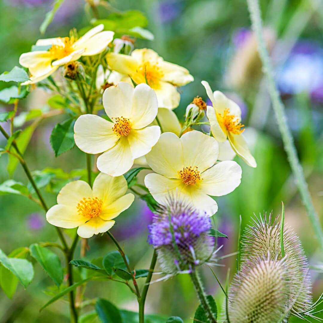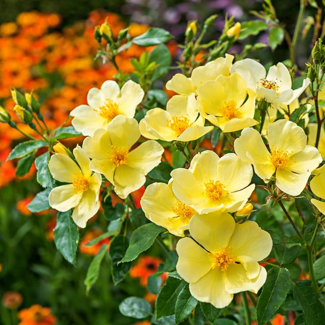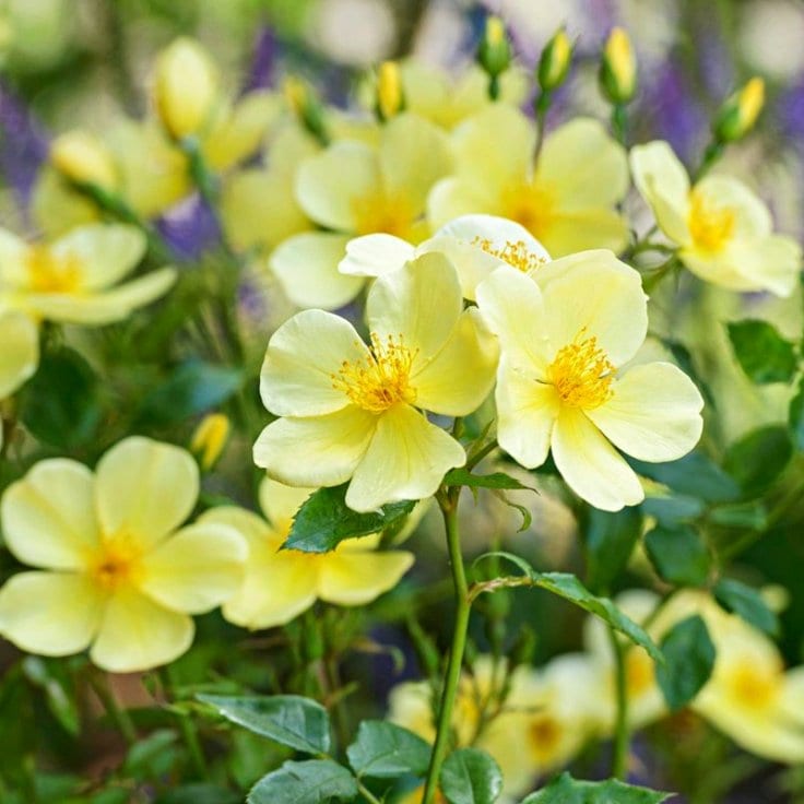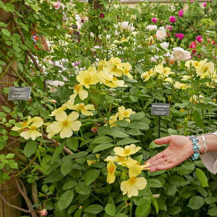 Florile lui Tottering by Gently au un aspect delicat si natural, sunt simple dar mari, cu un singur rand de petale galben stralucitor si un manunchi central de stamine aurii bine definite. Dar pe cat sunt de delicate pe atat sunt de multe florile lui Tottering by Gently! Sunt multe si grupate in paniculi imensi, iar impresia generala este de arbust care are mai multe flori decat frunze!